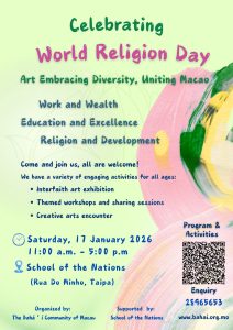 The Bahá’í Community of Macau warmly invites all residents to a special celebration of World Religion Day on Saturday, January 17, 2026, from 11:00 a.m. to 5:00 p.m. at the School of Nations.