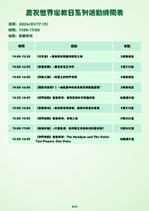 澳門巴哈伊團體誠摯邀請各位市民,參加於2026年1月17日(星期六)上午11時至下午5時在聯國學校舉行的「世界宗教日」特別慶祝活動。
